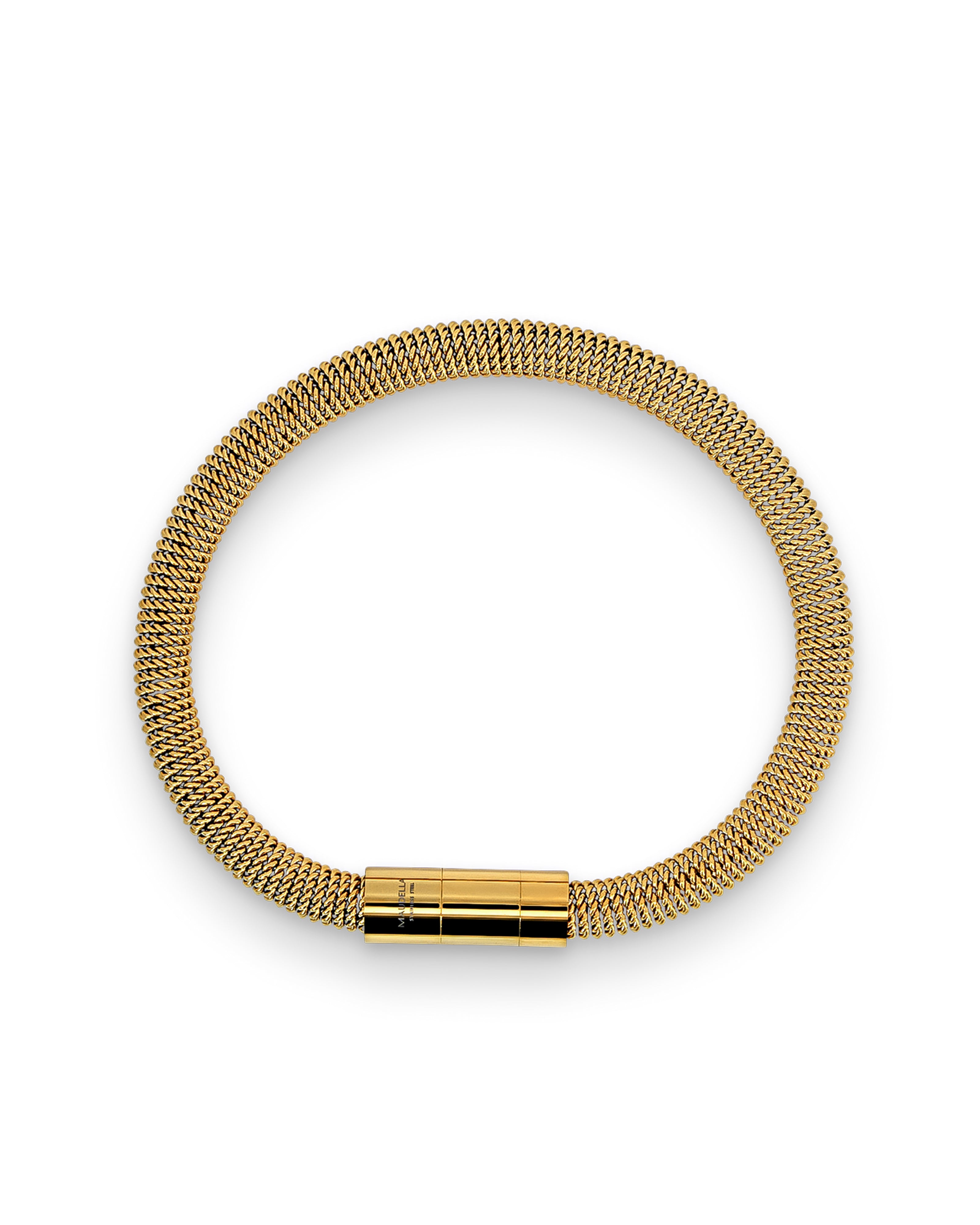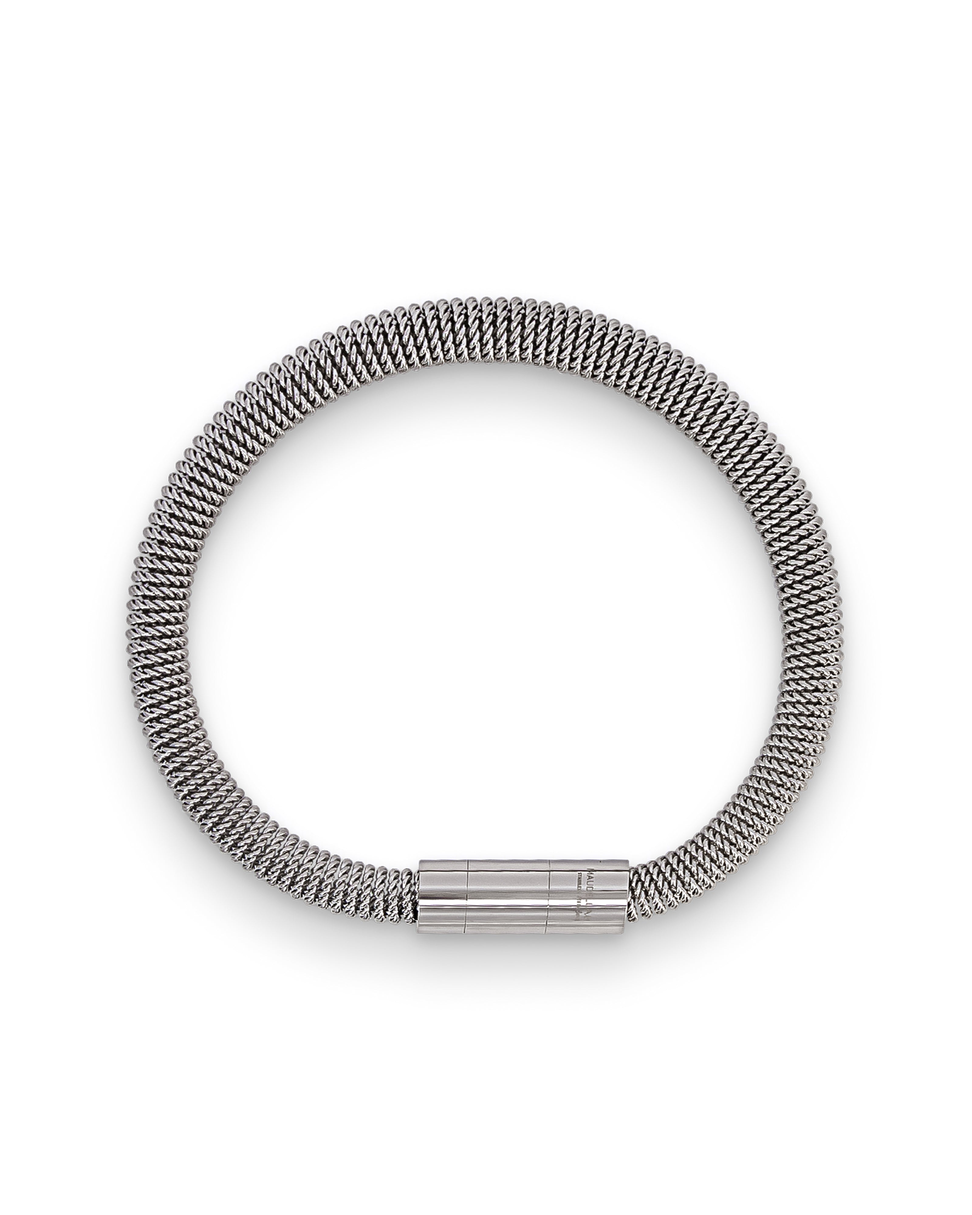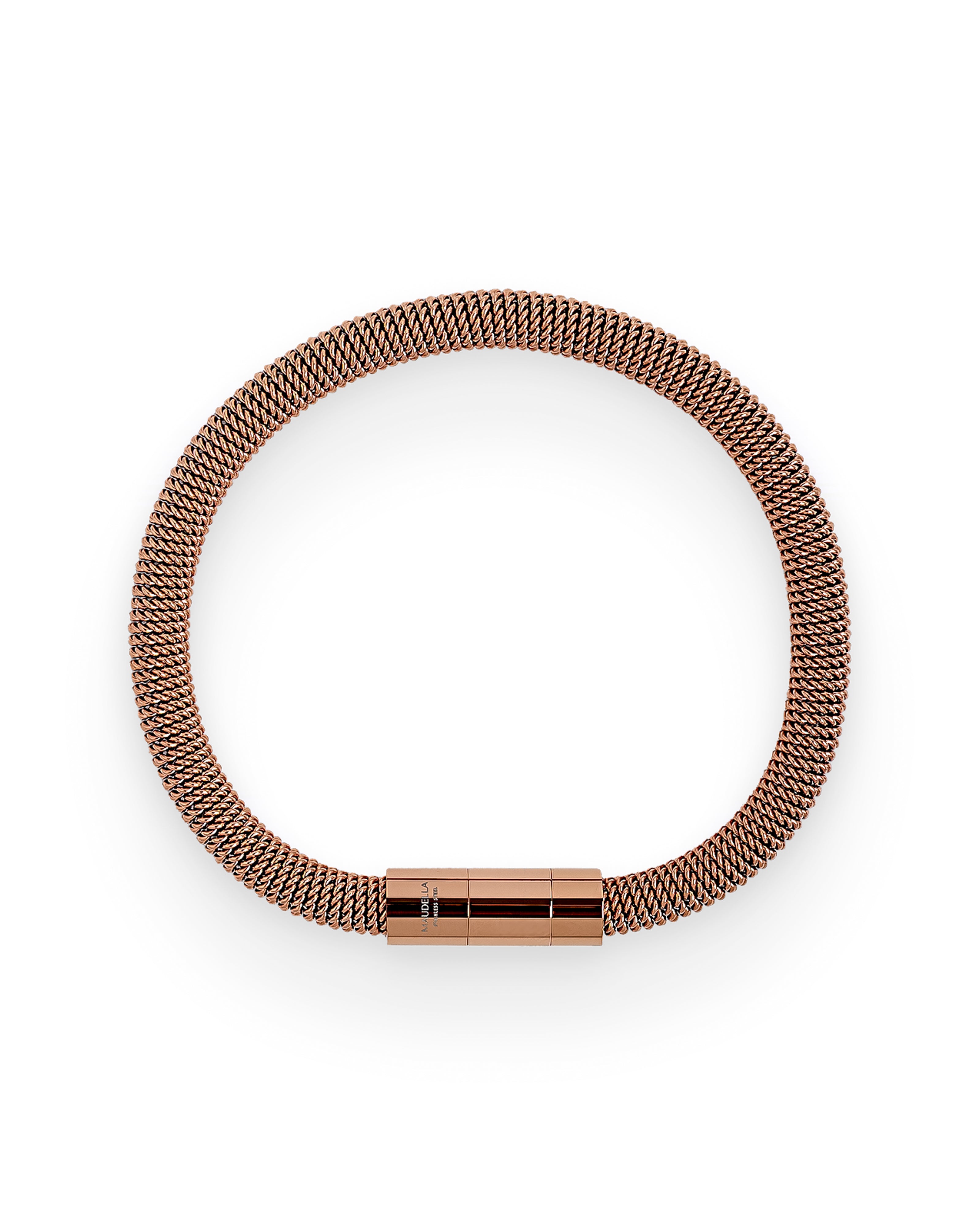 These stacking bracelets are designed with a tightly coiled chain that has a slight spring to it. The magnetic clasp closure is finished with a removable centre piece, so you can adjust the bracelet size to fit your wrist. Choose from three colour options, or layer them all as a bracelet stack.