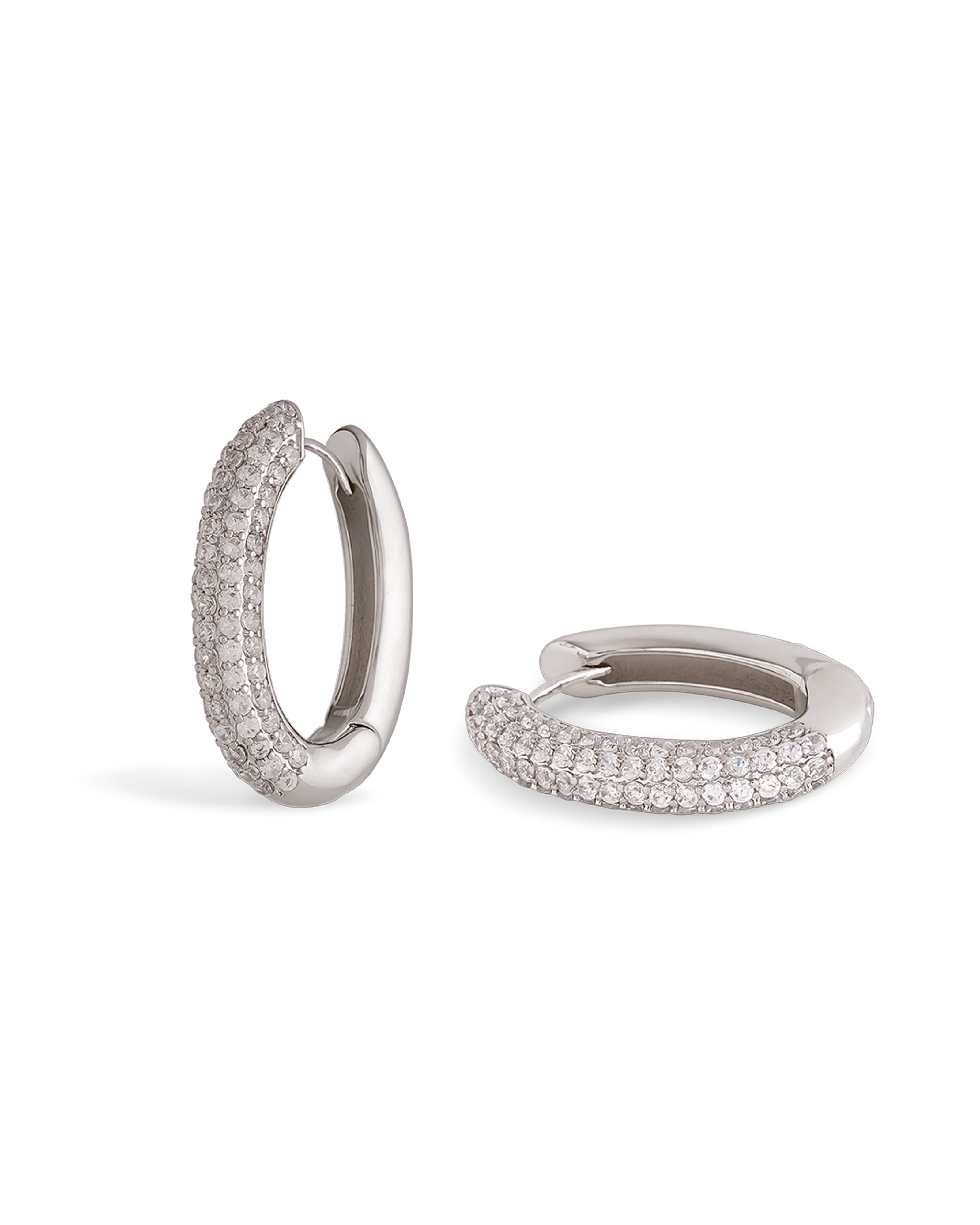 These oval hoops are chunky and dripping in clear cubic zirconia. If you love a statement hoop, these are made for you! With seven rows of cubic zirconia stones all set by hand, these catch the light from every angle. Plated with white gold for extra shine, these earrings are seriously sexy and ready to party!