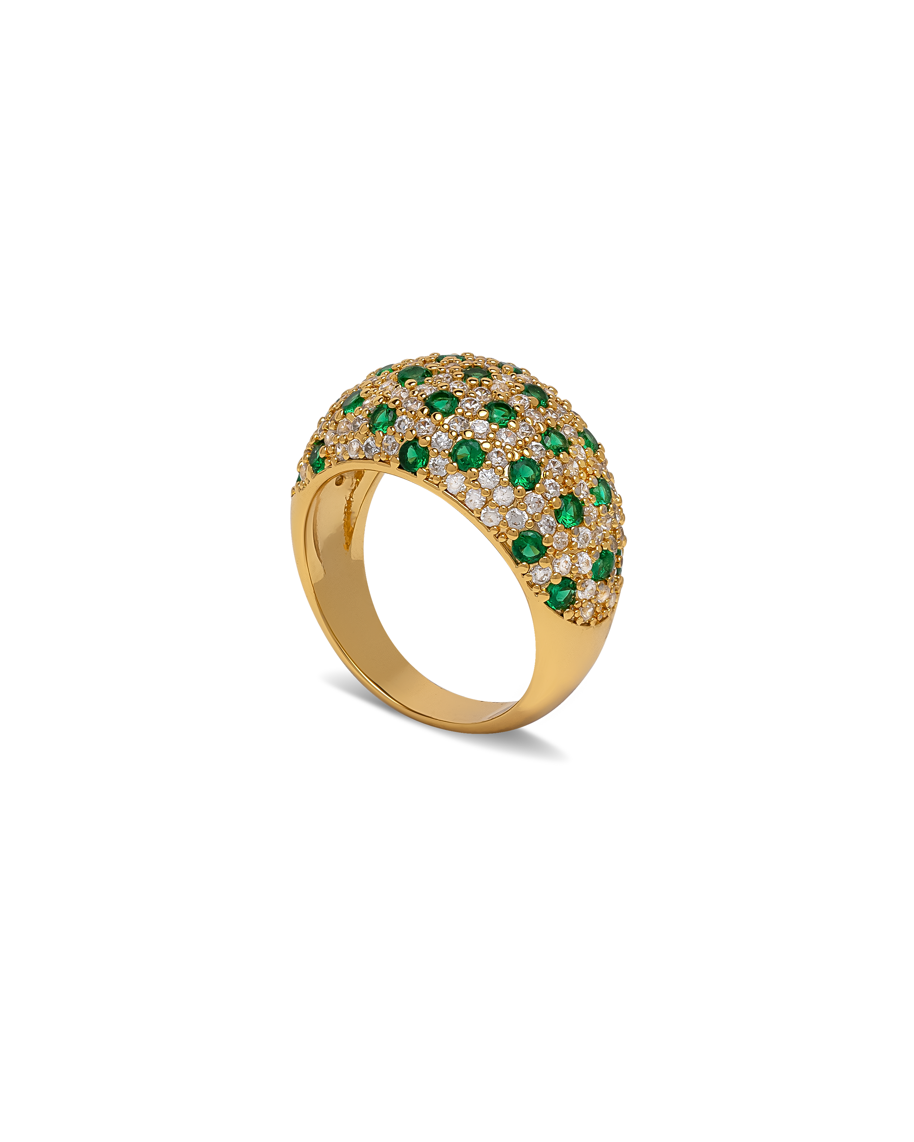 This beautiful ring is adorned with hundreds of cubic zirconia, each one meticulously set by hand. The larger green cubic zirconia are nestled in a charming polka dot pattern, surrounded by perfectly clear cubic zirconia that sparkle with every movement. This ring is elegantly plated with white gold for a chic finish. It effortlessly adds a touch of glamour to any outfit, whether you're attending an evening event or simply looking to elevate your everyday look with a hint of sparkle and sophistication.